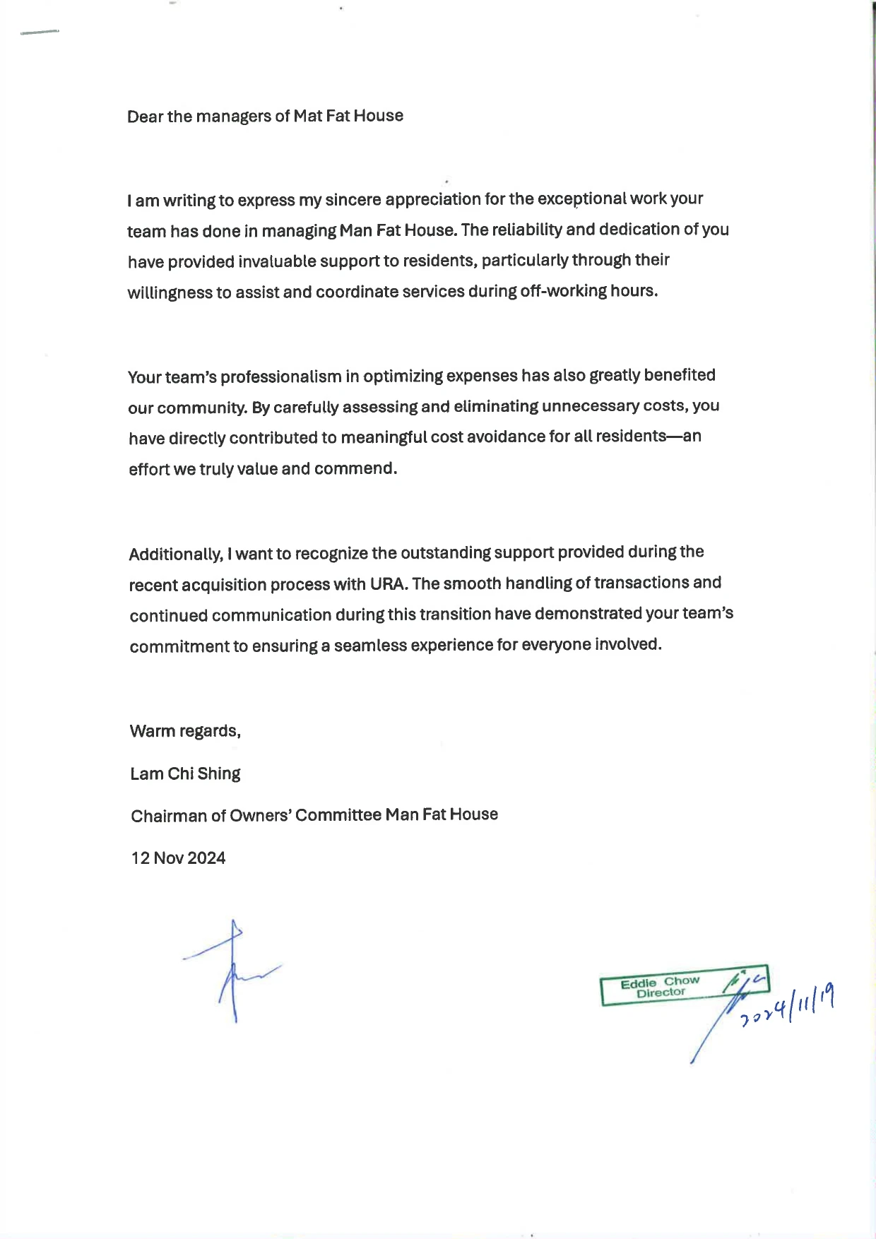 本公司現時全職員工超過300 人,寫字樓員工超過30 人,而物業管理部職員中,已有6 名職員持有物業管理人(第1 級)牌照及2 名持有物業管理人(第2級)牌照,5 名持有臨時物業管理人(第1 級)牌照,而本公司已於2022 年10 月正式取得物業管理監管局發出的物業管理公司牌照(C-405064)